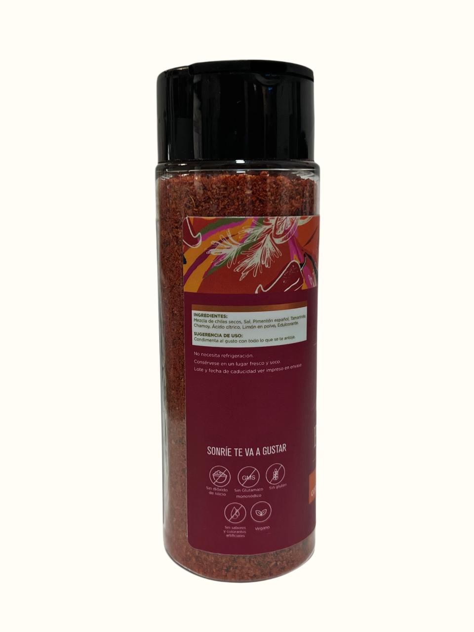 Ingredientes: Mezcla de chiles secos, Sal, Pimentón español, Tamarindo, Chamoy, Ácido cítrico, Limón en polvo, Edulcorante.